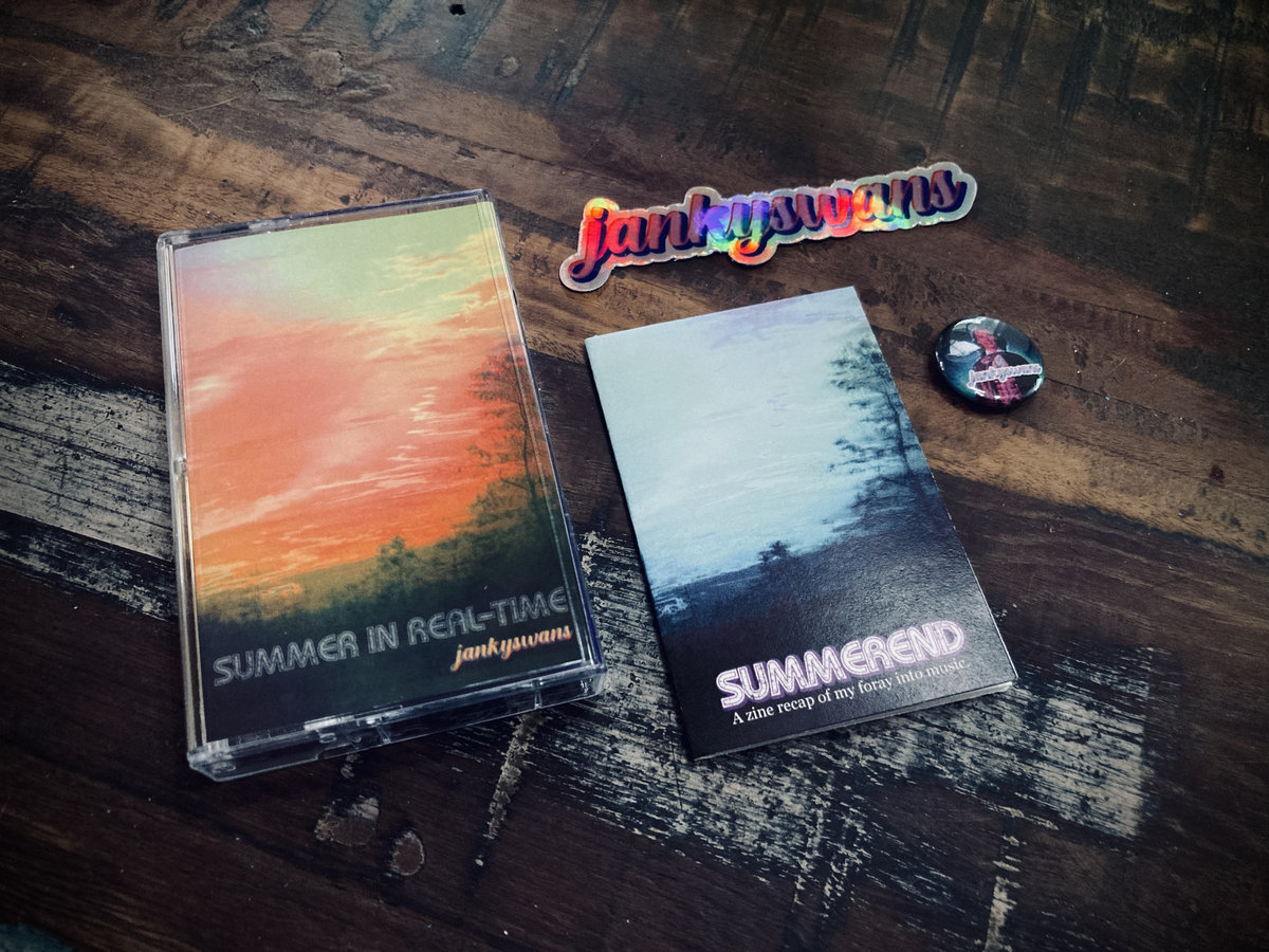 "Summer in Real-Time" on purple cassette tape in a clear case, shrink-wrapped. Ships with a die cut sticker, 1" button, 6-page mini zine, and additional download codes.